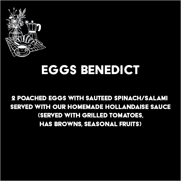 2 poached eggs with sautéed spinach/salami served with our home made Hollandaise sauce