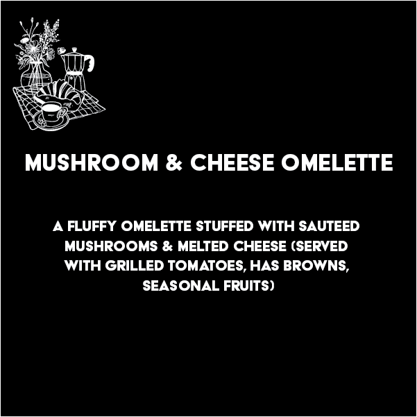 A fluffy omelette stuffed with sautéed mushrooms & melted cheese.